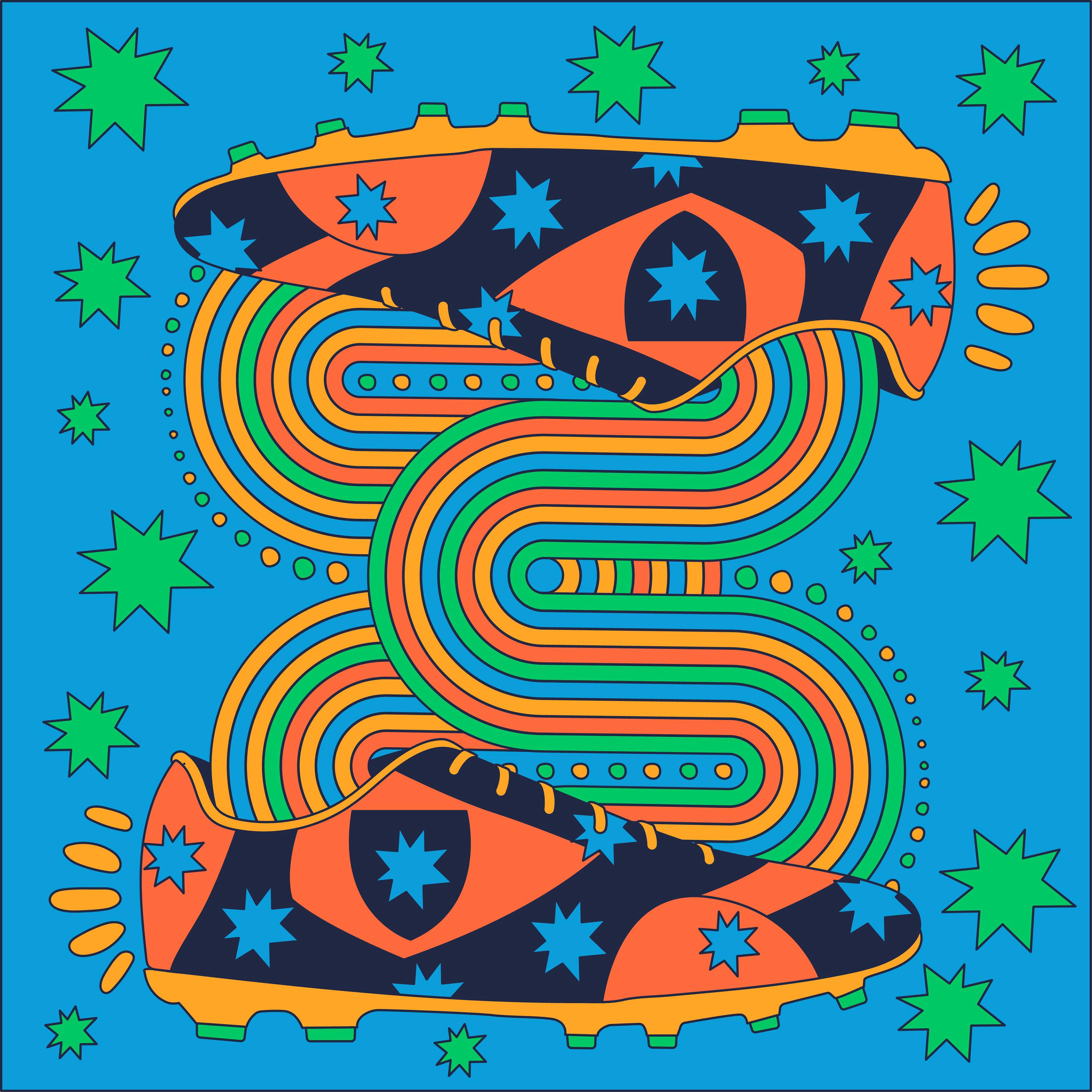 The design was my take on the connection between a coach & their player. The shoes represent the player and the coach. The colorful lines connecting them are the similar roads both coach and player have experienced from training to bonding with teammates